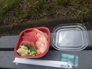 ほどなくして、入れられた海鮮丼を受け取り、お店を出ます。