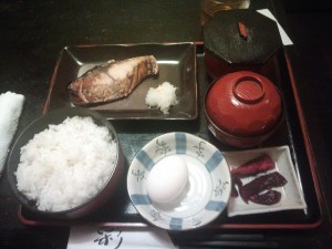 焼魚のブリの他、生卵、柴漬け、みそ汁に、小鉢のひじきがあり、種類が豊富だと感じます。