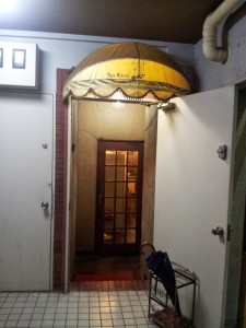 その黒板メニューの脇に、マンションのようなビルがあり、そちらの奥の方に入口があるので、傘をたたみ、そちらの入口に向かいます。