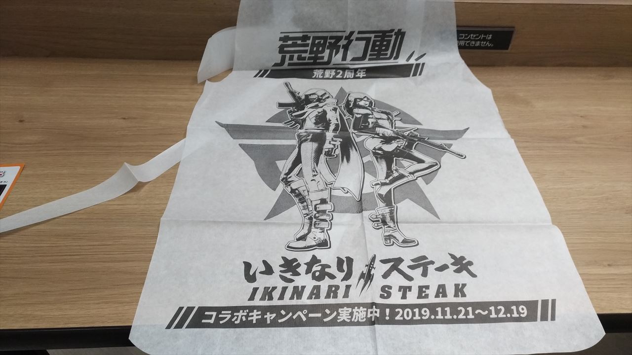 渡された、紙エプロンには「荒野行動」というゲームと、いきなりステーキがコラボしている旨の記載があります。